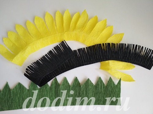 - Из зеленой гофрированной бумаги вырезаются равные полоски такой же ширины, но длина немного меньше длины желтых лепестков.