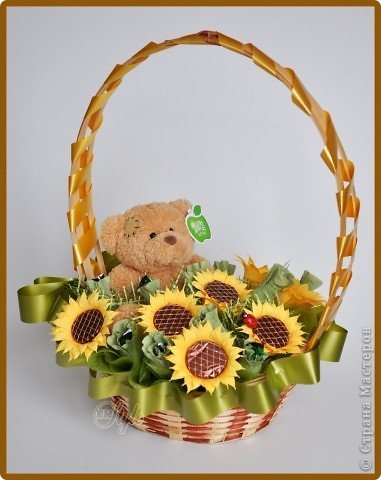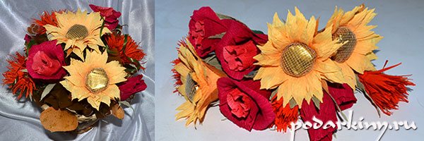Каждый мастер-класс по-своему оригинален, но все они выполняются в одинаковой технике. При желании, можно украсить дополнительными элементами, которые придадут ему изысканность и неповторимость. Букеты из таких подсолнухов выглядят очень реалистично и очень похожи на настоящие подсолнухи.