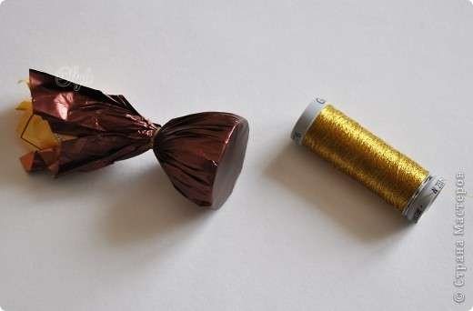 Теперь приступим к созданию самого цветка. Отрезаем квадрат полисилка такого размера, чтобы можно было им обмотать конфетку. После того, как конфета будет завернута, края квадрата необходимо закрепить с помощью нити. Не беда, если вдруг у Вас не оказалось полисилка, в этом случае нужно просто подобрать конфету, в подходящей для серединки, упаковке.