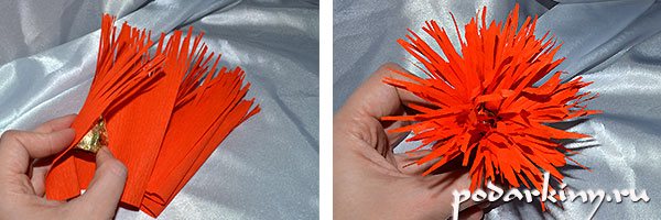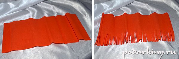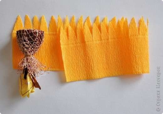 - Из желтой гофрированной бумаги вырезаются полоски шириной 1,5 см и формируются лепестки.
