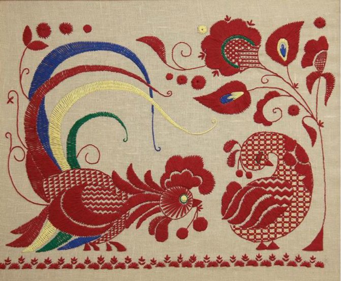 Рисунок вышивается по контуру, причем длинные стежки проходят по лицевой стороне, а с изнанки делаются только прерывистые короткие линии. Во владимирской глади преобладают в основном однотонные цвета — красный, зеленый, желтый, синий.