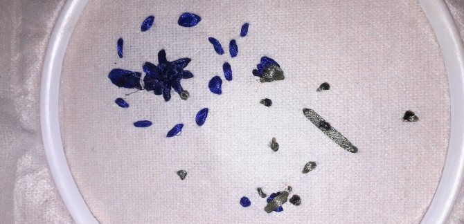 Заправив толстую синюю нить мулине в иглу, закрепляем её и приступаем к серёдке. Она вышивается французскими узелками на ножке.
