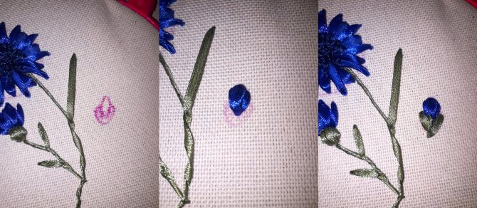 Чтобы вышить бутончик, рисуется набросок. Далее одним-двумя простыми или ленточными стежками вышиваются лепестки. Для придания объема цветочной почке у основания лепестков делается французский узелок. Он закрывается лентами при помощи простых стежков.