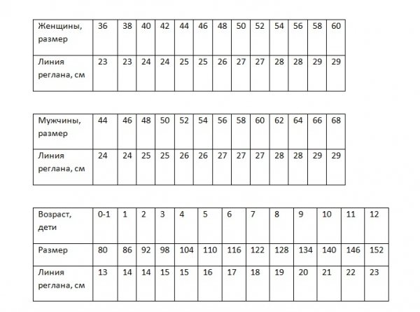 Реглан снизу вверх представляет собой диагональные отрезки от подмышечных впадин до крайних точек горловины переда и задней части, формируются линии реглана за счет убавок, причем убавки можно делать, используя различные схемы, в том числе, в качестве декоративных элементов. Для определения длины линии можно использовать данные таблицы.