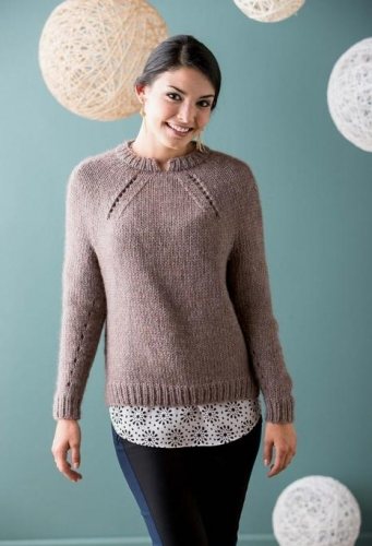 После выполнения изделия по данной схеме с бесшовными деталями, связанными на круговых спицах, нет необходимости сшивать части. При этом для начинающих не рекомендуется для изделия, связанного регланом снизу вверх, использовать сложный узор. Как вариант, можно украсить рельефным орнаментом только центральную часть свитера.