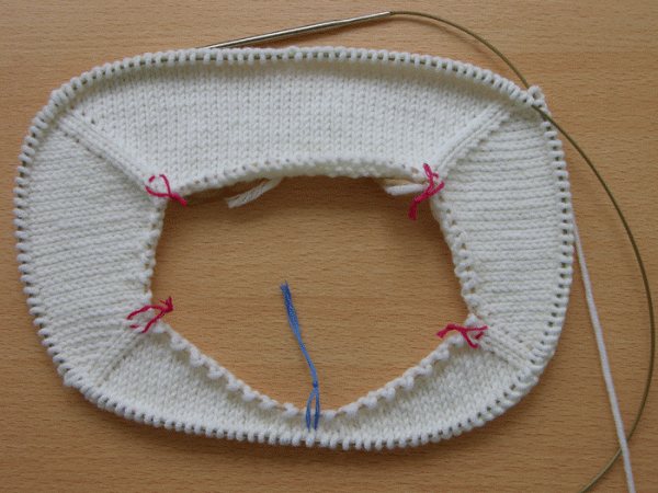 Если вы не хотите, чтобы ваше изделие, связанное спицами снизу вверх, оттягивало назад, сделайте росток, разницу между высотой переда и спинки. Для выполнения работы необходимо вязать укороченными поворотными рядами, оставляя небольшую часть переда изделия непривязанной. Предварительно определитесь, какую часть петель переда выделить для прямой линии горловины. Если вы хотите сделать круглое горлышко, достаточно оставить 10-12 петель, для горловины овальной формы, напоминающей лодочку, потребуется больше петель. С каждой стороны выделенной части вешаем специальные маркеры.