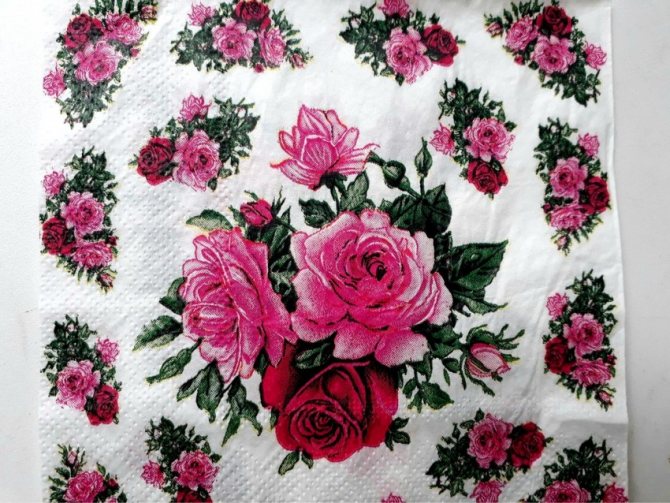 Рисовая бумага, которая используется в декупажных работах – это наиболее тонкая бумажка из существующих для подобных работ, имеющий шероховатости на поверхности. Основой подобных салфеток являются волокна из риса. Лицевую сторону используют для нанесения различных рисунков и изображений.