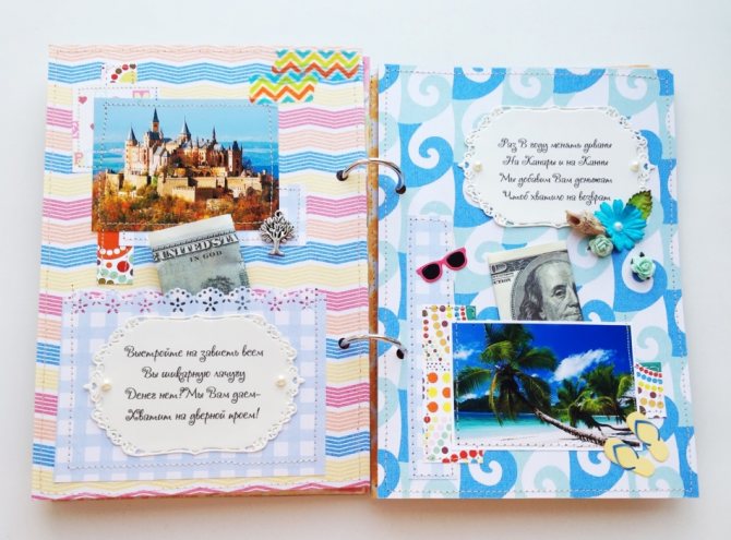 Украсить странички подготовленными вырезками, фотографиями. Сделать кармашки для купюр, украсить.