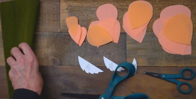 Для этой работы нужно подготовить шаблоны. При помощи их нужно будет вырезать лепестки и листочки для розы из зеленой, оранжевой и розовой бумаги.