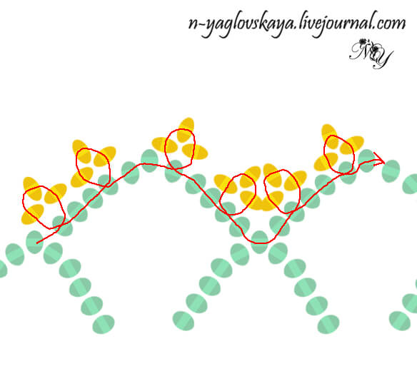 - В пятом ряду делаем арки на каждой 2, 4 и 6 бусине.