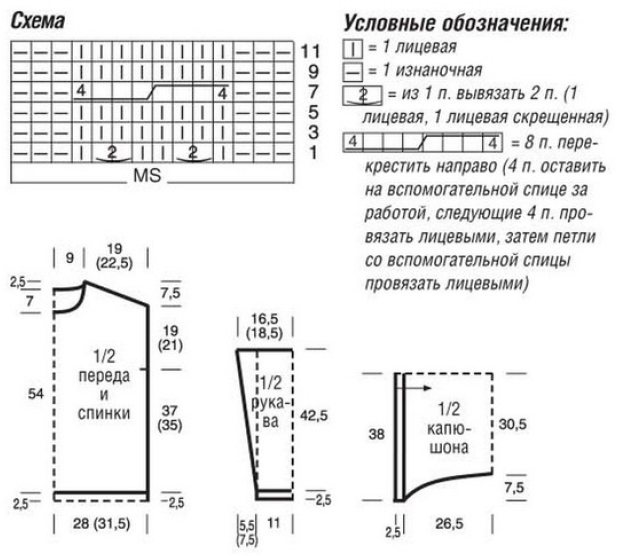 Плотность вязания: 20 п. и 26 р. лиц. глади, спицы № 4 = 10 x 10 см; 34 р. узора из кос = 8 см.