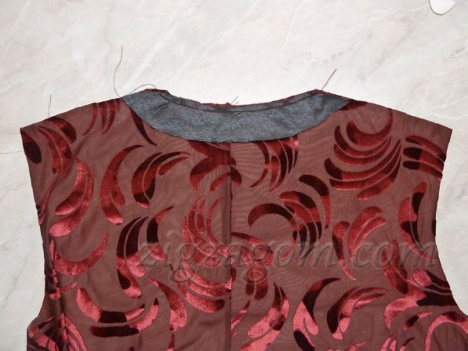 Чтобы горловина не растягивалась, дублируем срез полоской тонкого флизелина, выкроенного по контуру горловины спинки шириной 1,5 см.