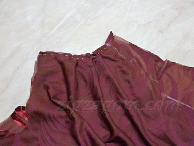Так как трикотажное полотно здесь имеет поперечное направление, то оно будет постоянно растягиваться. Поэтому закрепляем узким и редким зигзагом (можно фигурной строчкой, которая есть на современных машинках), такая строчка эластичная и нитка никогда не лопнет.