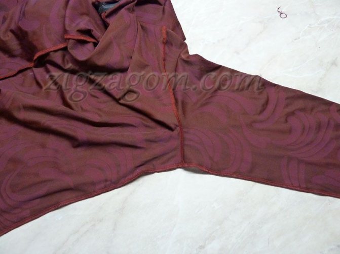 - Далее нужно обработать пройму на платье. Для этого загнуть припуски для свободы облегания в области рукавов, а потом обработать швом зигзаг или оверлочным.