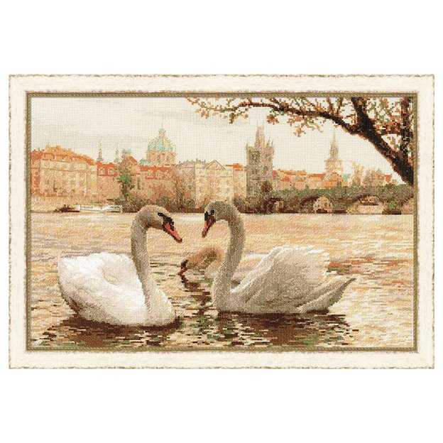 Белые лебеди, которые плывут по водной глади на фоне городского пейзажа и старинного моста вызывают у зрителей самые различные чувства, от спокойного созерцания до печальной меланхолии. Вся картина выполняется в уравновешенных белых и коричневых тонах, в этом ее особенность и прелесть. В наборе имеется канва Zweigart Аида 14 бежевого цвета, нитки мулине Anchor (25 оттенков). Техника вышивки счетный крест, а размер картины 30х45 сантиметров. В наборе также содержится цветная схема.