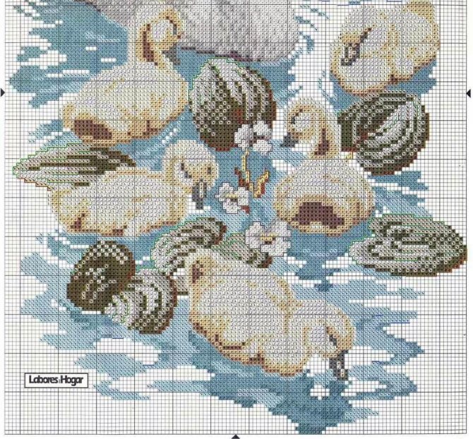 Картина с изображением мамы лебедя с утятами не оставит никого равнодушным. Ее можно повесить в гостиной или в детской комнате. Для вышивания этой схемы потребуется 24 цвета ниток. Канва для картины подойдет белого или светло-голубого цвета. Она послужит фоном для вышитого рисунка.
