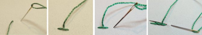 Берем иголку с зеленой ниточкой, сложив ее в три раза, и прошиваем стебельки. Итак вышиваем стебель в технике «назад иголку».