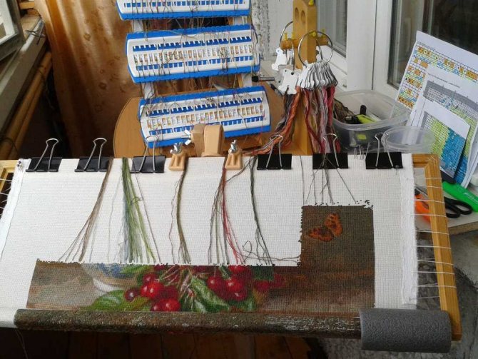 Очень удобно, когда все находится под рукой. Тем более это важно при вышивке больших по размеру работ с несколькими десятками, а то и сотнями различных оттенков ниток.